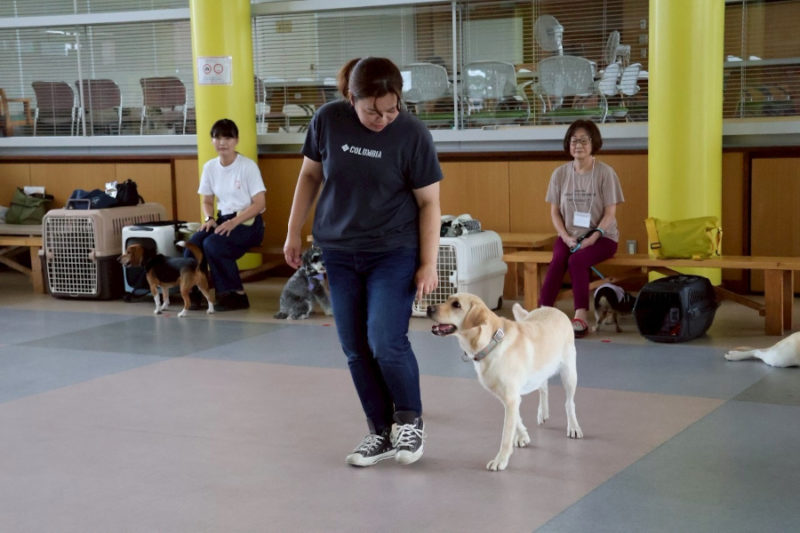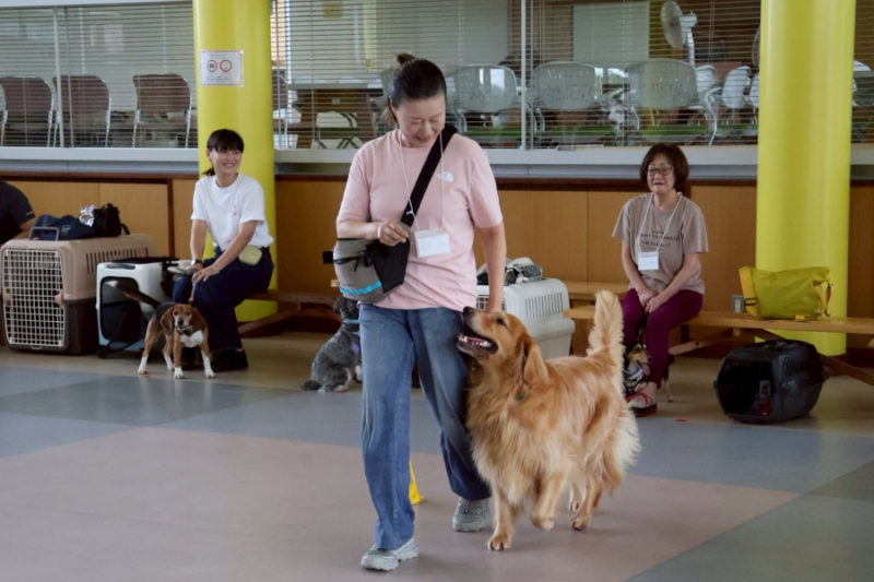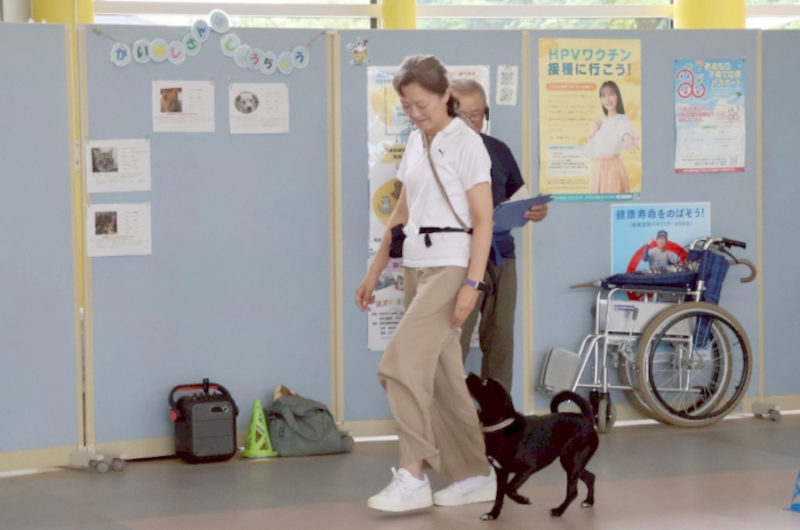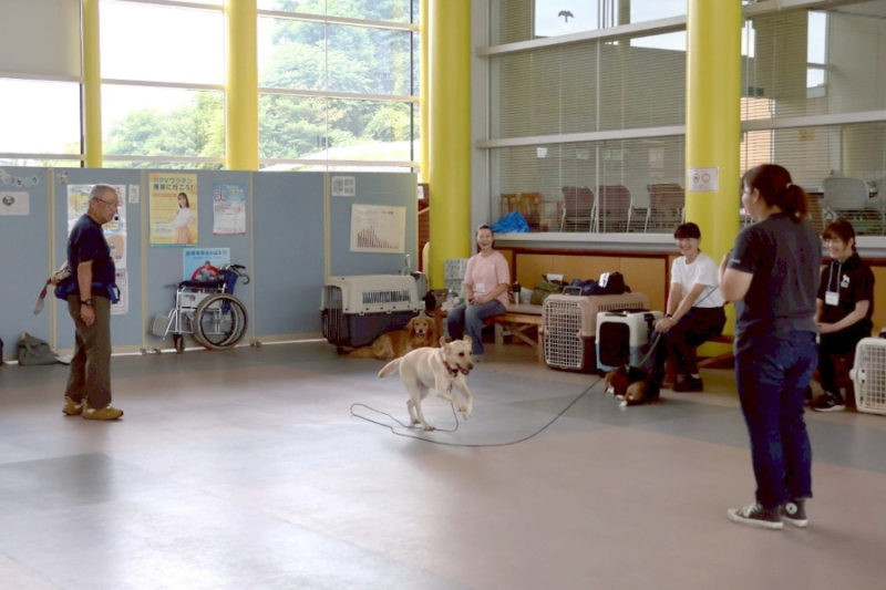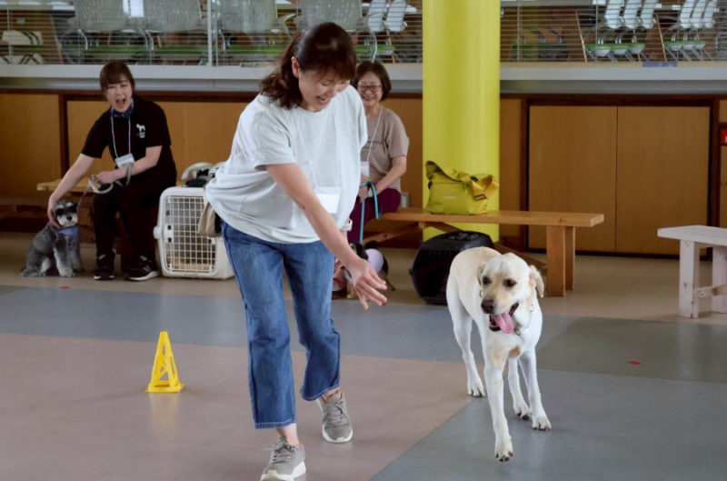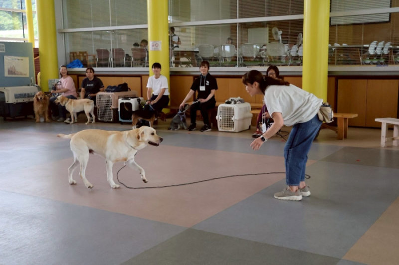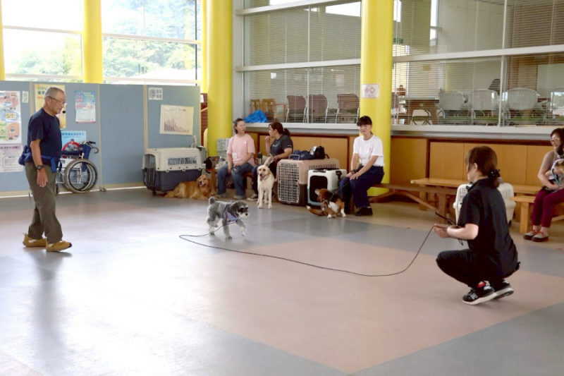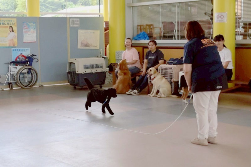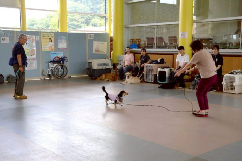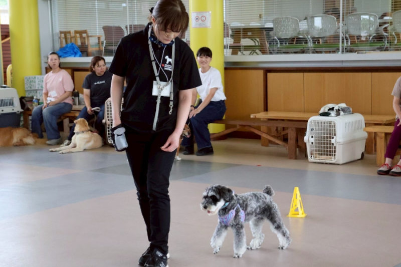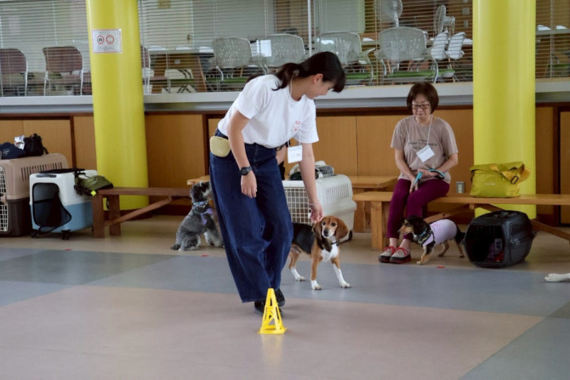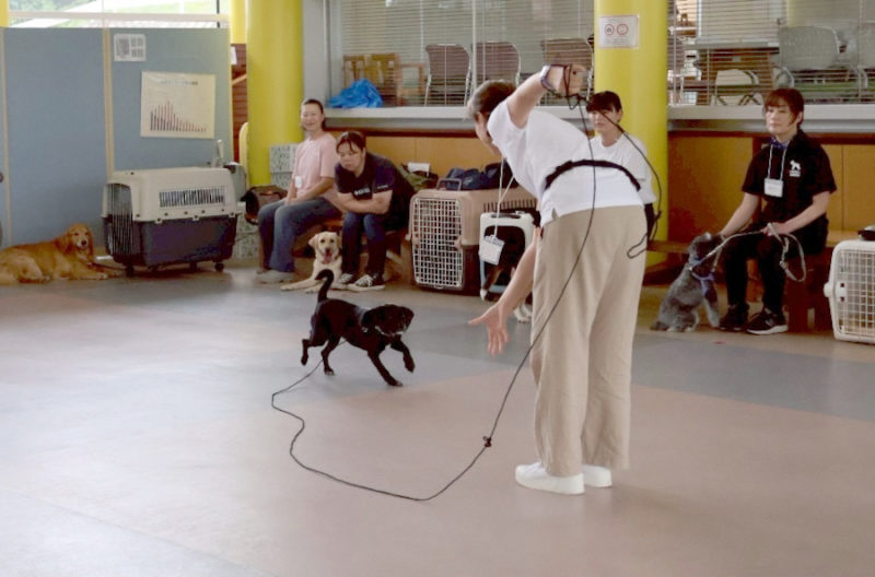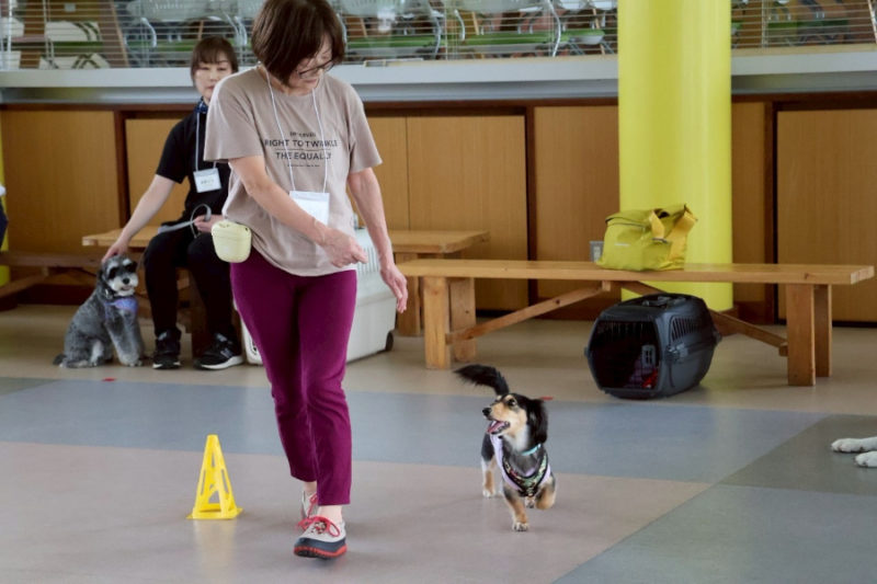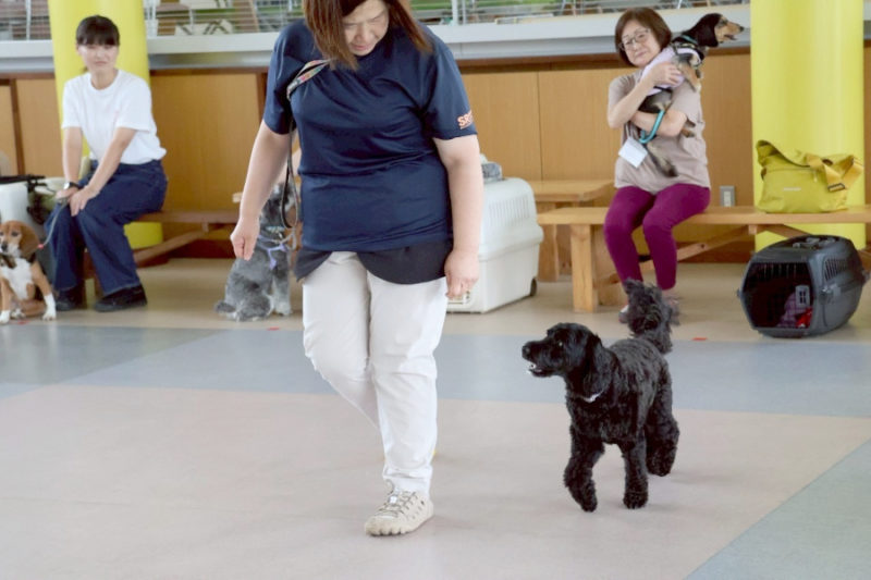 第9回セラピー犬講習会では、新しい内容が増えてきました。ノーリードで脚側行進を行ったのですが、はじめての挑戦でも、ごほうびをうまく使いながらハンドラーのそばを意識して歩くことができていました。