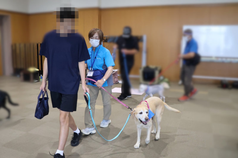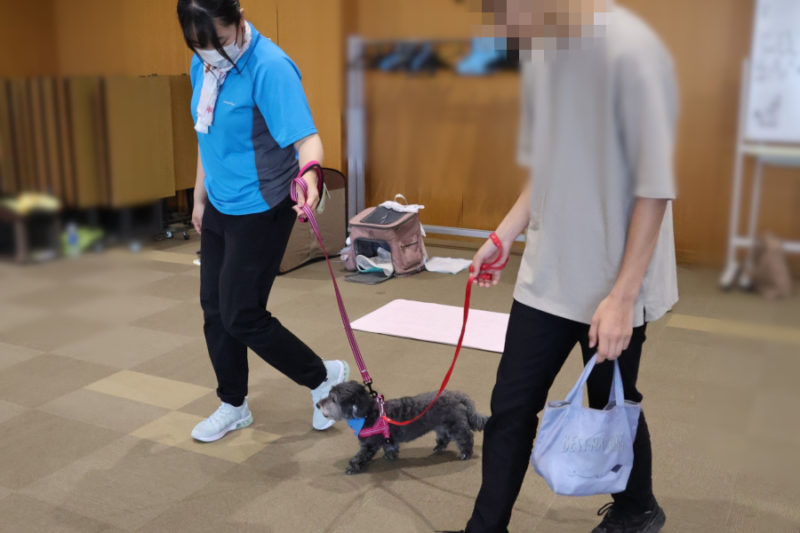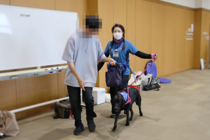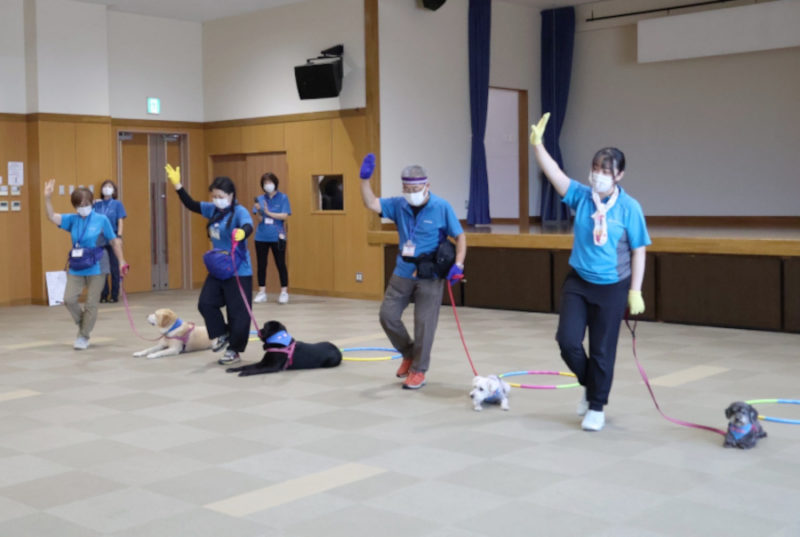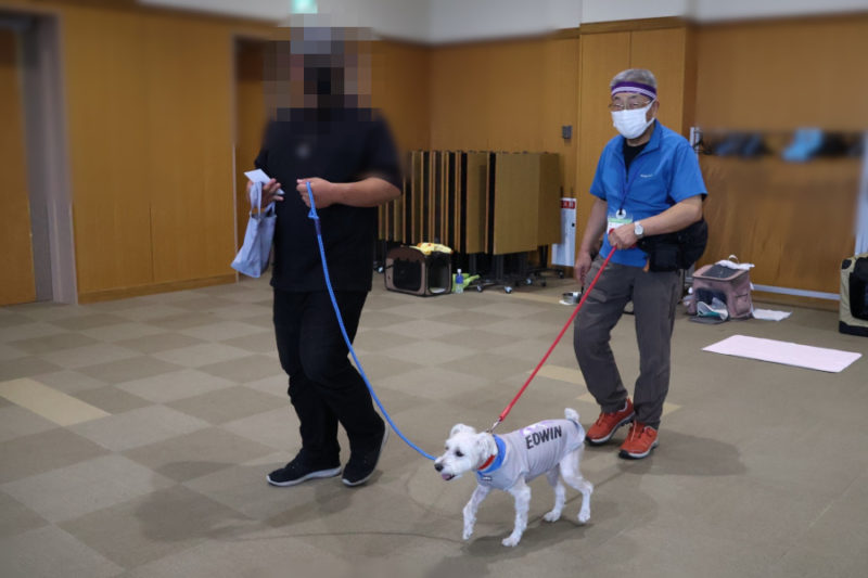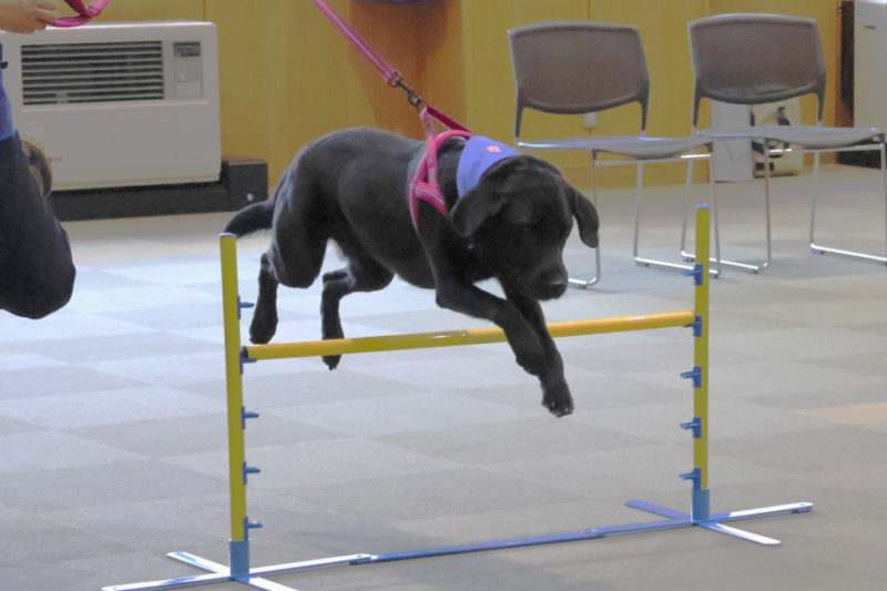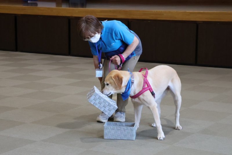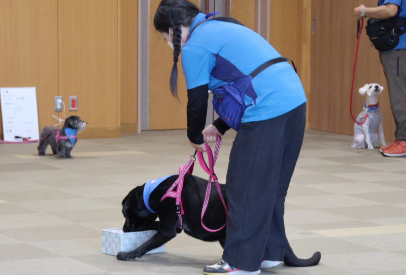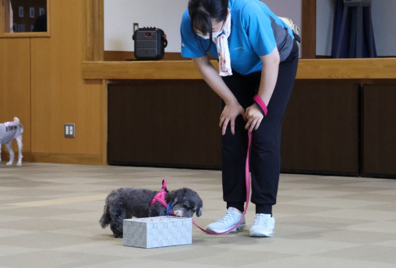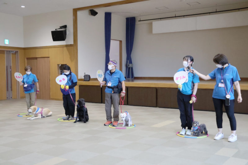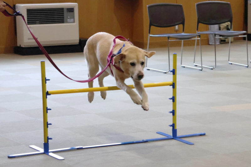 その後は、「トンネル」や「ポールジャンプ」、「みっけ」に挑戦しました。また「お散歩体験」では、リードを持って犬と歩く楽しさを体験してもらいました。最後にはもう一度ふれあいの時間を取り、ごあいさつをして退場しました。