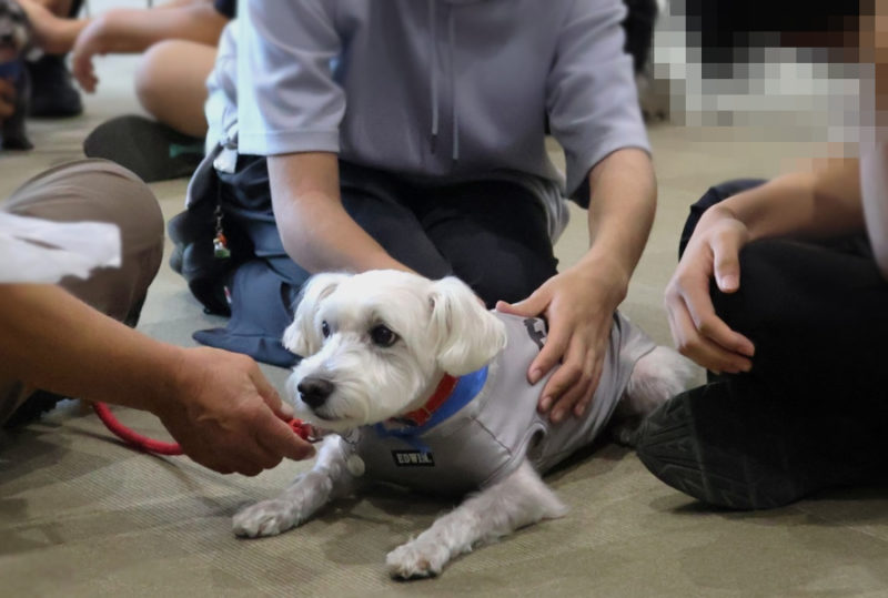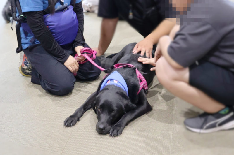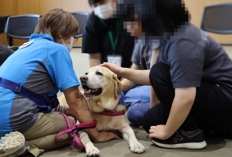 続いては、子どもたちが楽しみにしていたふれあいの時間です。やさしくなでたり、写真を撮ったりしながら、犬たちとのふれあいを楽しんでいました。