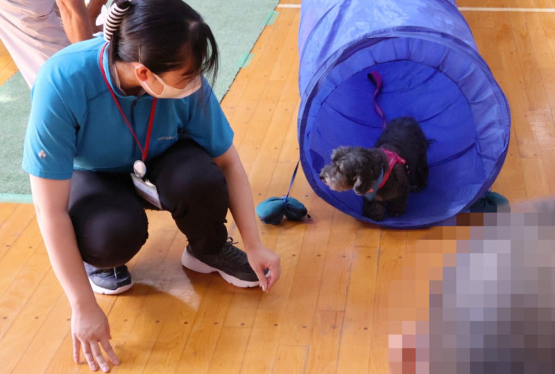 続いて、ふれあいタイムです。最初はおそるおそる犬に触れていた方もいましたが、少しずつ慣れるにつれて笑顔が見られるようになりました。