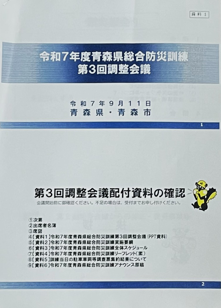 青森県総合防災訓練の第3回調整会議に出席しました(青森市) セラピー犬 X Facebook はてブ LINE コピー 2025.09.11 日時 2025年9月11日(木)13:30~15:30 場所 青森県青森市宮田高瀬22-2 新青森総合運動公園内 サブアリーナ 出席者 村田 道子 中野渡 綾子 岩本 良二 内容 第2回調整会議内容の修正変更及び確認