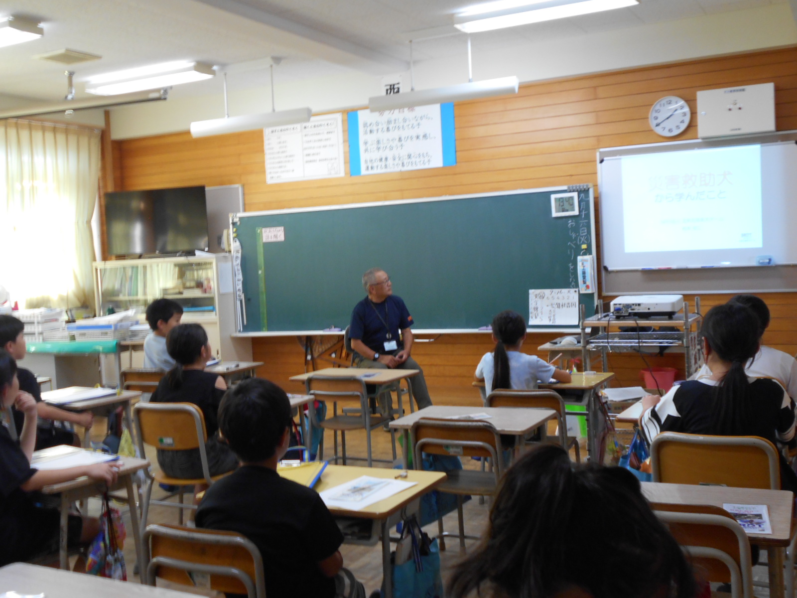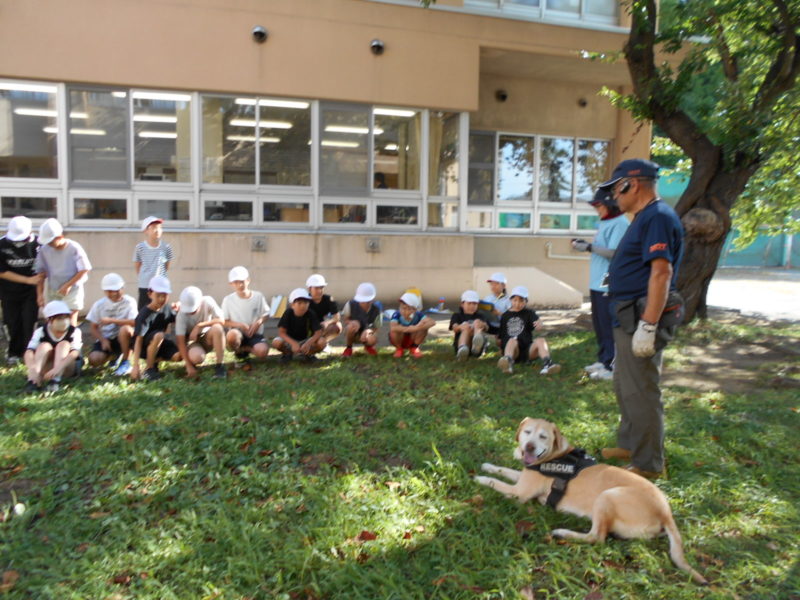 皆さん熱心にお話を聞き、たくさん質問をしてくれました。捜索のデモでは、訓練の様子を「三太郎」が見せました。捜索の実演では、遠くのネット裏に隠れた要救助者を浮遊臭を頼りに「もみじ」が素早く発見し、ハンドラーと一緒に生徒たちも走って確認しました。犬の捜索能力の高さにみんなびっくりしていました。
