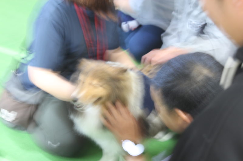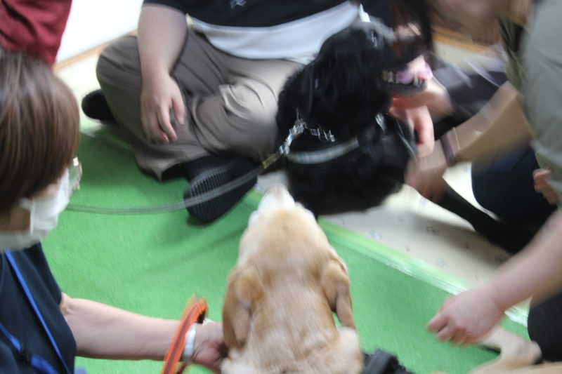 雨が降ってきたため、室内での触れ合いになりました。初め犬にさわれなかった方も、帰るころにはさわれるようになり、犬の持つ不思議な力を今回も感じました(岩本良二)。