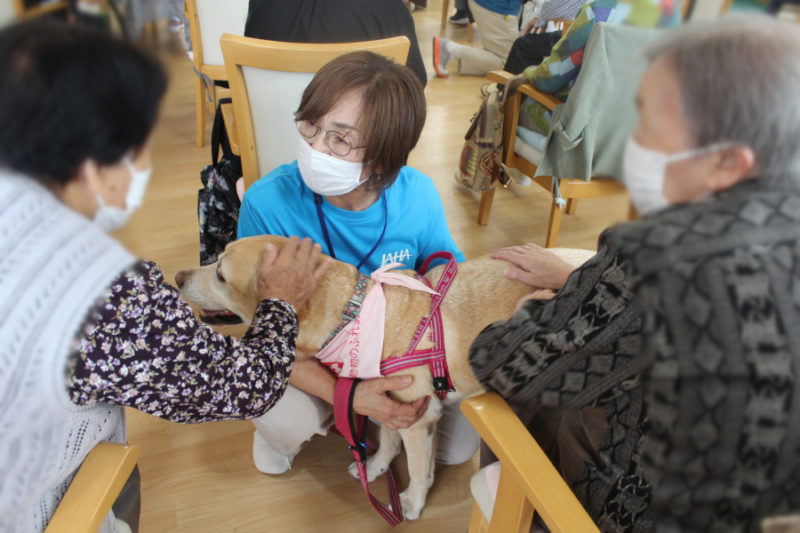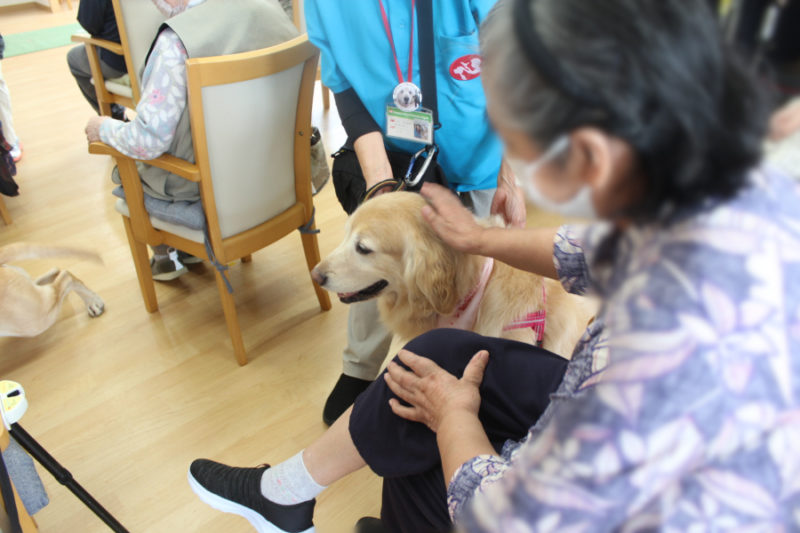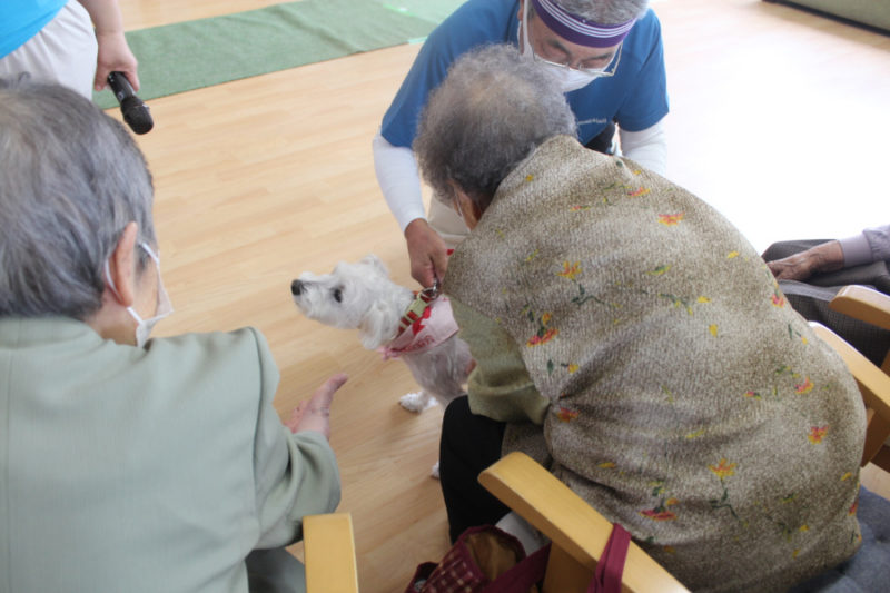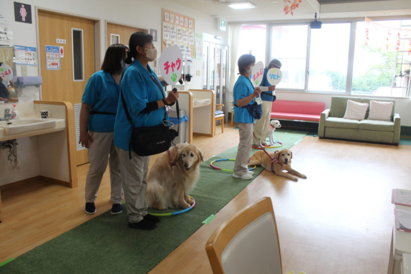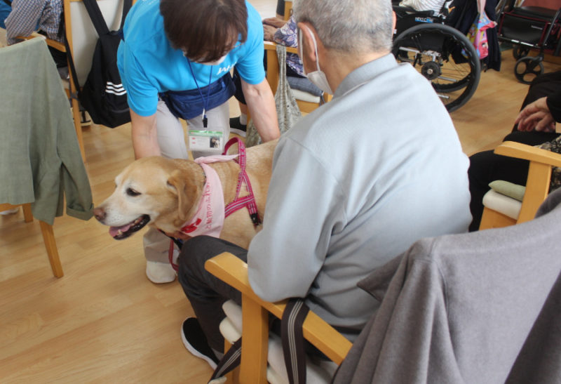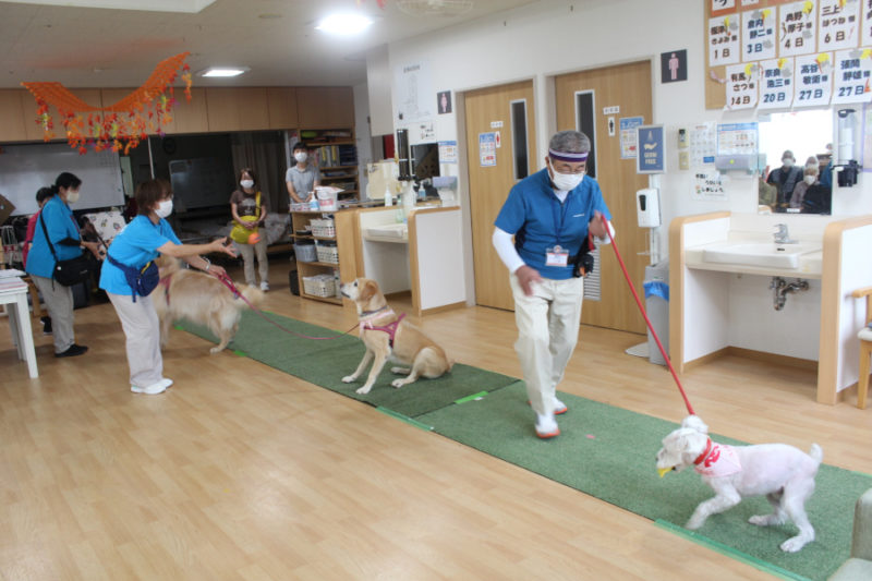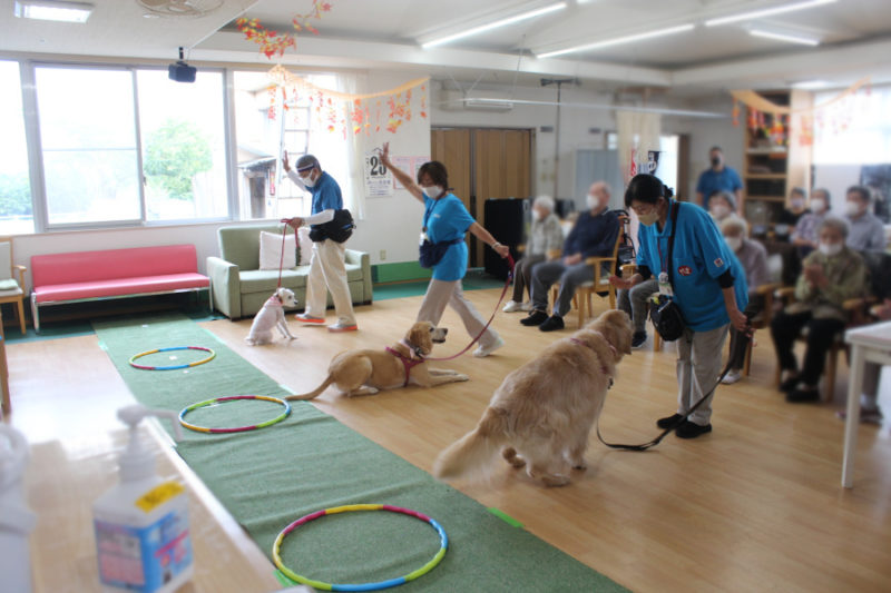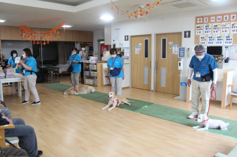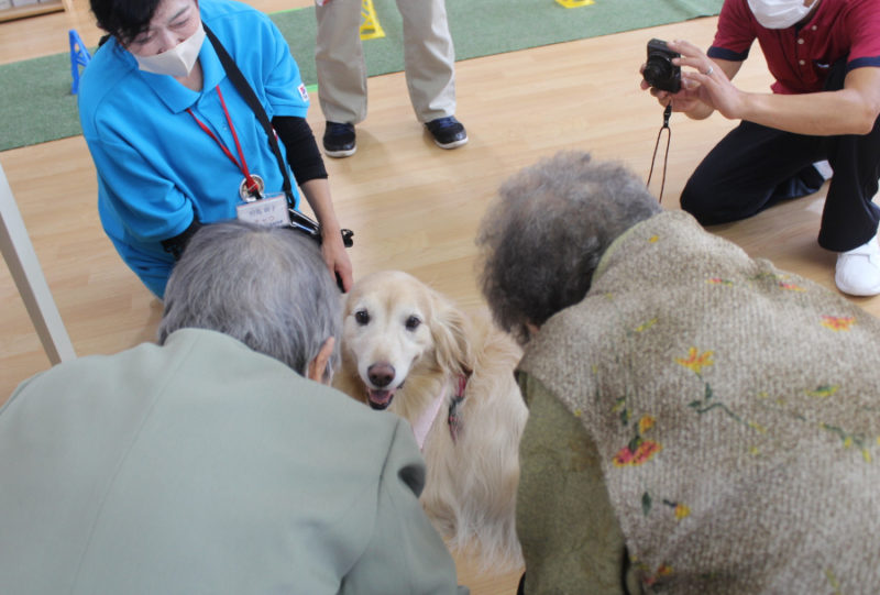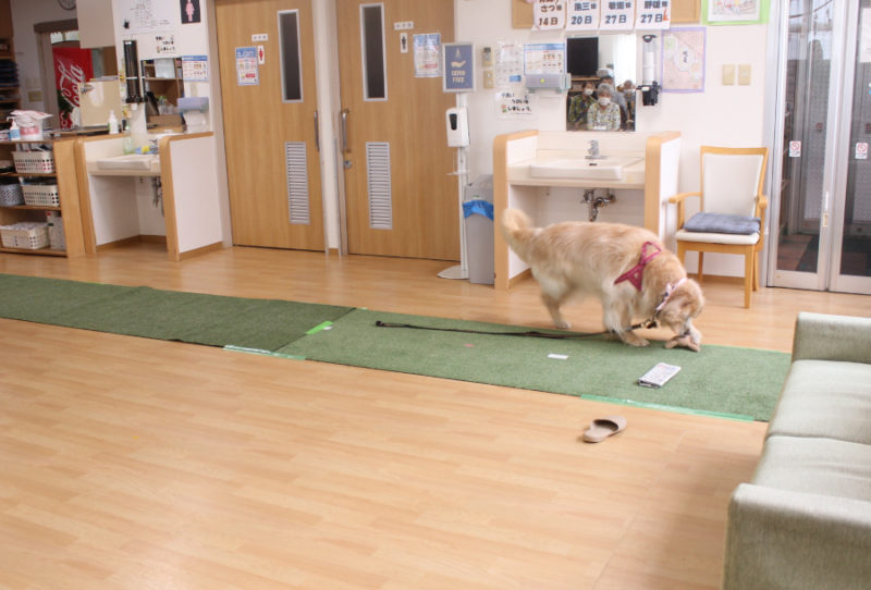 続いて「持ってこい」はぬいぐるみや新聞やスリッパを犬がそれぞれ持ってくるトリックです。可愛らしい姿に笑顔があふれました。「カードひき」はおすわり・ふせ・キャッチ・おいでを書いたカードを引いてもらい、犬が掛け声に合わせるトリックです。「私の声でやってくれたの?」と嬉しそうにしてくださる方もいました。