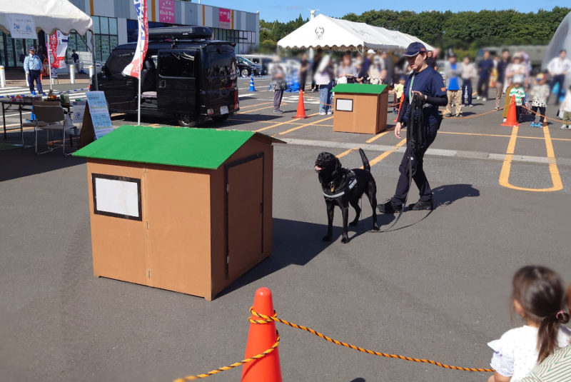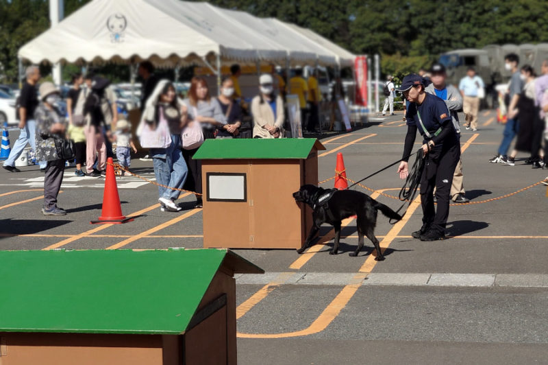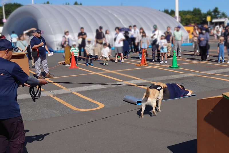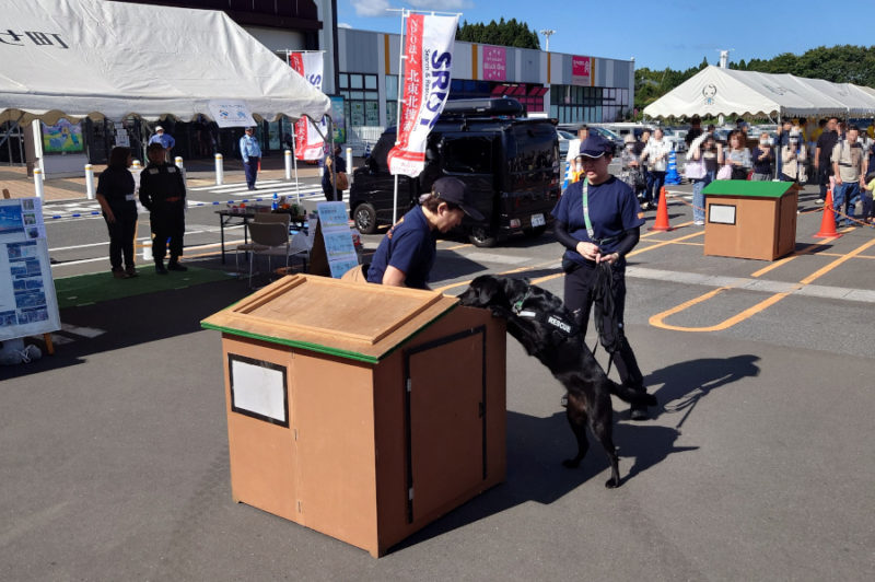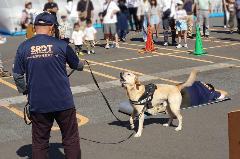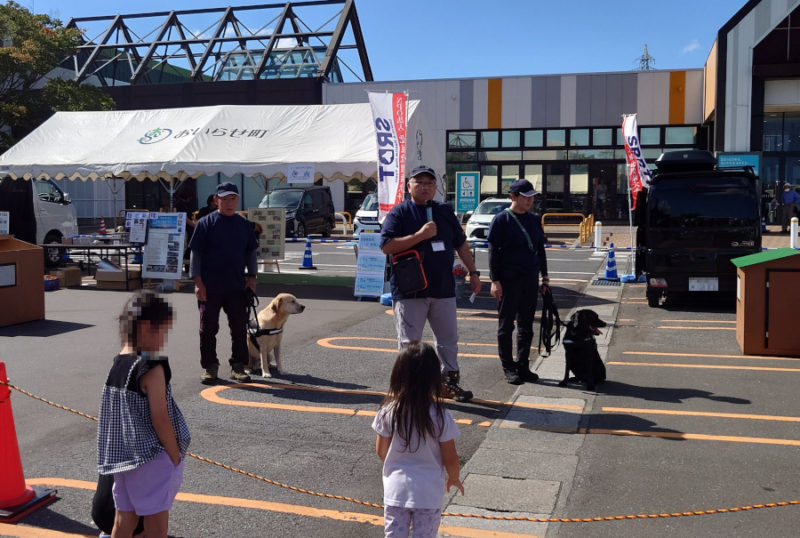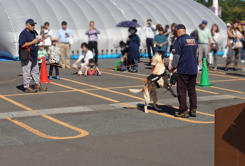 開始まもなくの災害救助犬デモンストレーションでは、たくさんの方に集まっていただきました。司会の質問に答えてくださったり、犬が要救助者にアラートする場面では拍手や感嘆の声をいただき、活気のあるものになりました。
