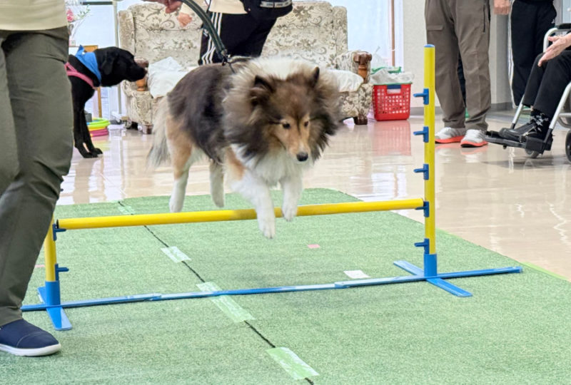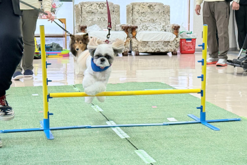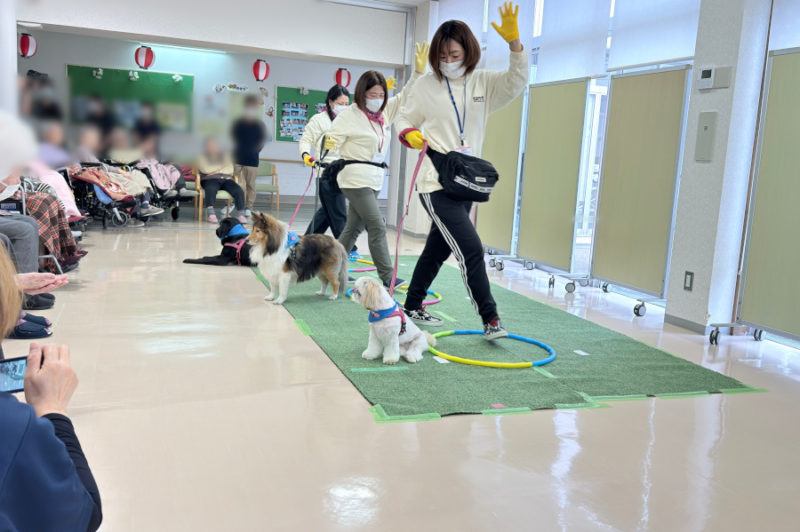 続いて、トンネルくぐりやポールジャンプ、職員の方にも参加していただきながらフラフープ取りなど、元気いっぱいに披露しました。