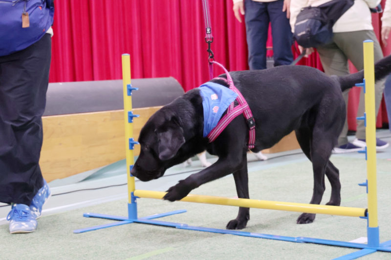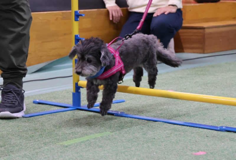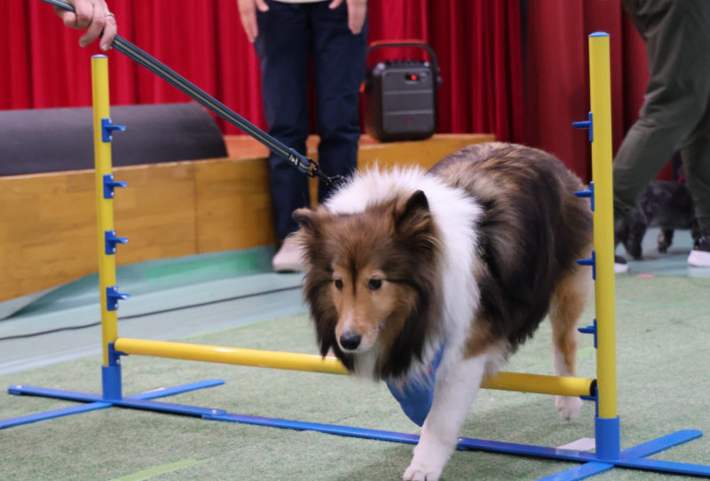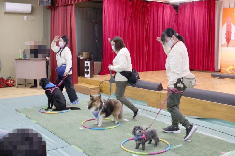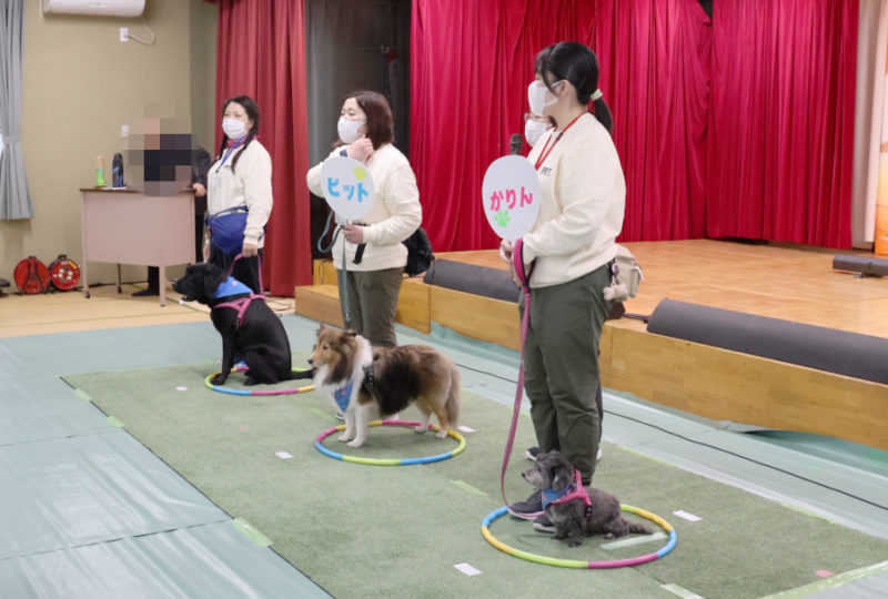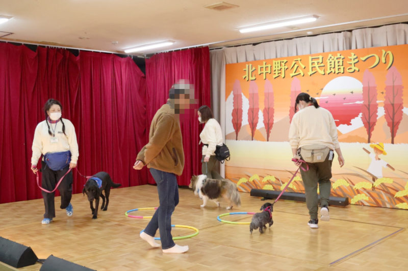 北中野公民館祭りに、セラピー犬たちが参加しました。会場にたくさんの方が来てくださり、まずは音楽に合わせて入場し、整列してごあいさつをしたあと、「犬のおまわりさん」のダンスを披露しました。