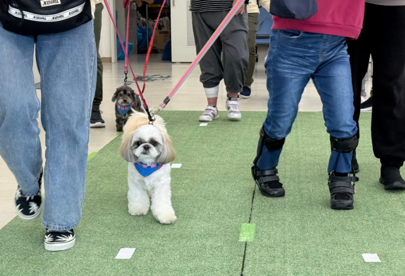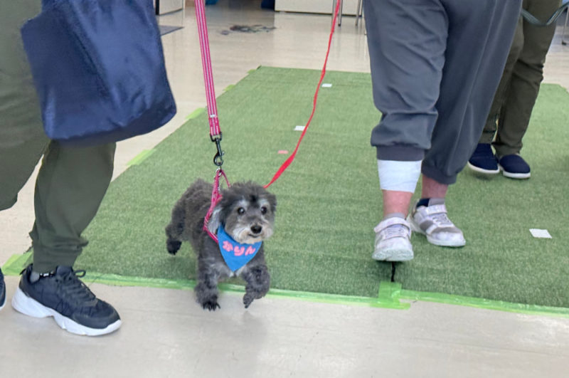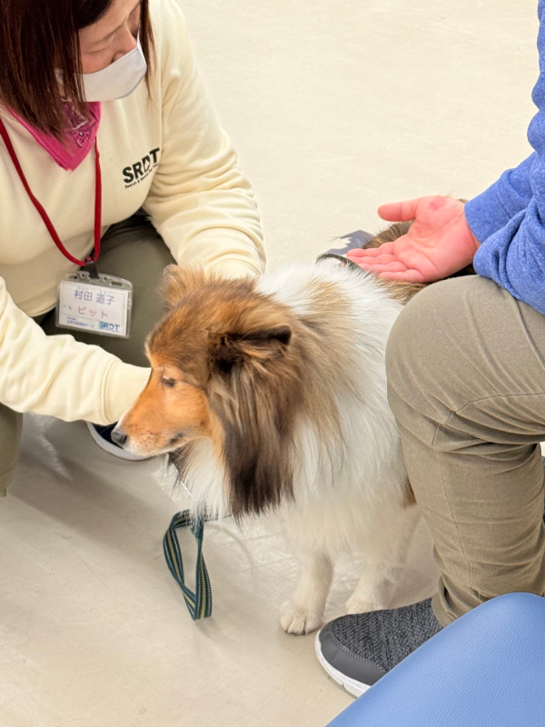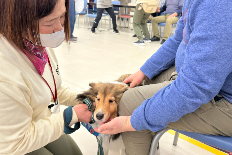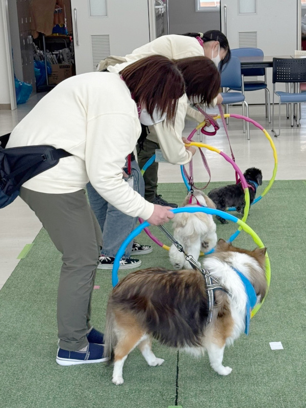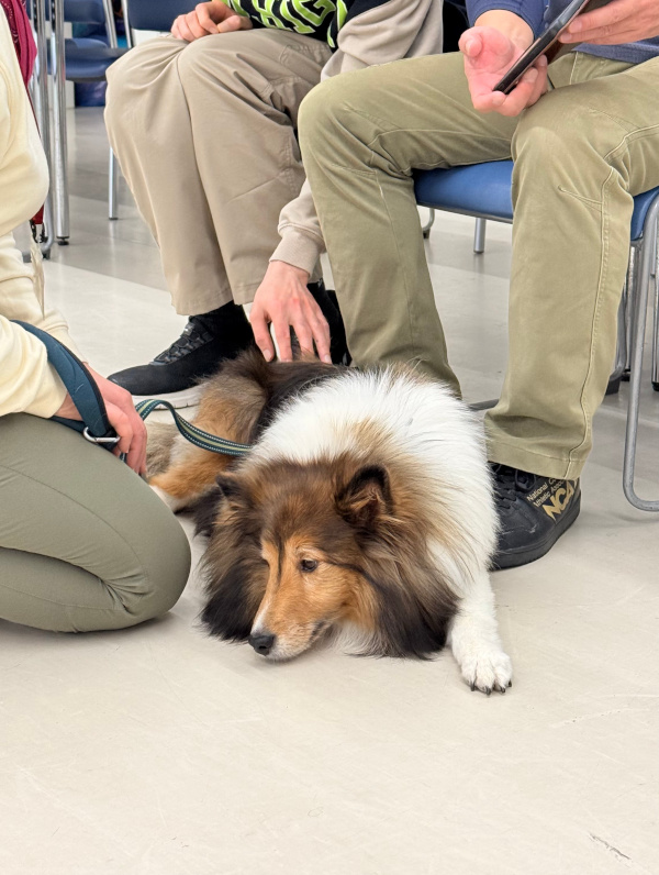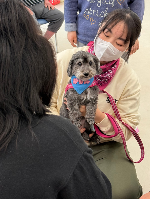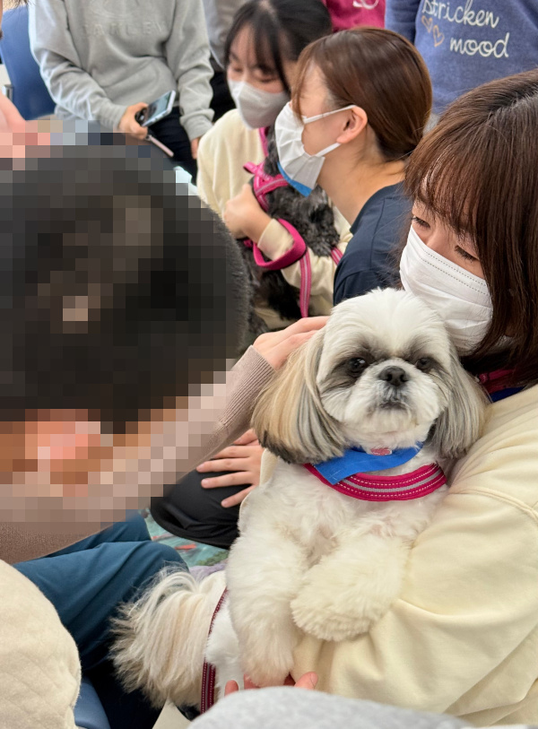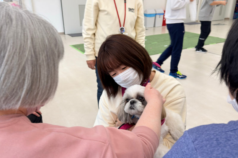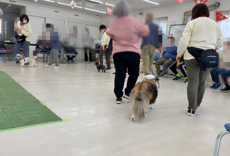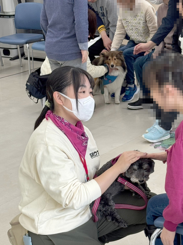 音楽に合わせて入場、ごあいさつのあと、「犬のおまわりさん」のダンスを披露しました。ダンスのあとは、お待ちかねのふれあいです。楽しそうに犬たちを撫でて笑顔になったり、少し苦手でも触ってみたいと言ってくれたりと、とても楽しそうなふれあいの時間でした。