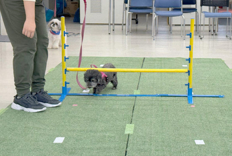 次の「ポールジャンプ」では、犬の名前を呼んで元気いっぱい応援していただきました。続いて披露した「スラローム」でも、犬たちの頑張りに拍手が寄せられました。