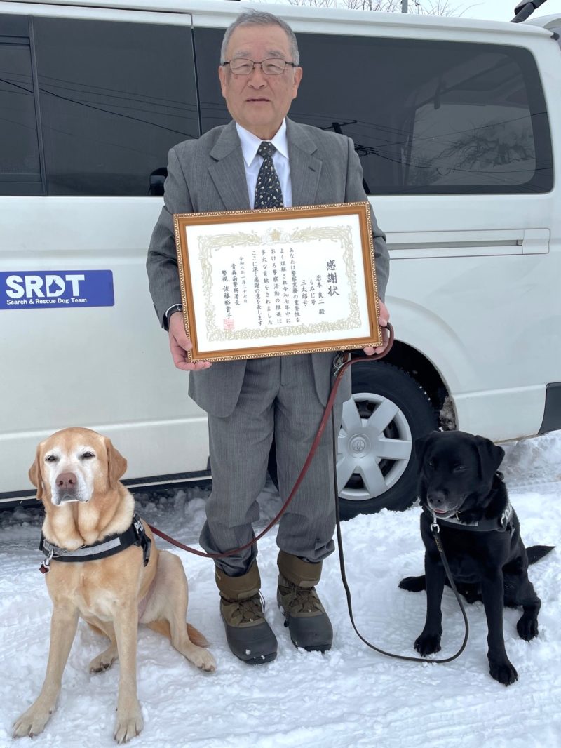 昨年は行方不明者捜索以外にもアップルヒルや青森南警察署において、広報活動として警察犬の行方不明者捜索のデモンストレーションを行うなど、嘱託警察犬の活躍の場をたくさん与えていただきました。この場をお借りしてお礼申し上げるとともに、今年も2頭の仲間と一緒に更なる貢献を決意したところです(岩本良二)。